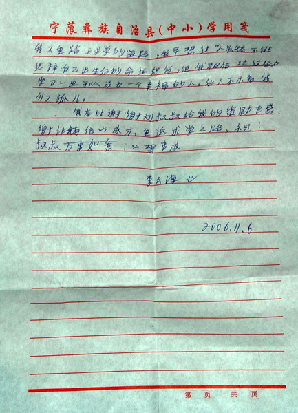 2006年3月8日,我受信天谨游的委托,前往西布河中学进行家庭困难,人品优良、成绩优秀的学生调查。