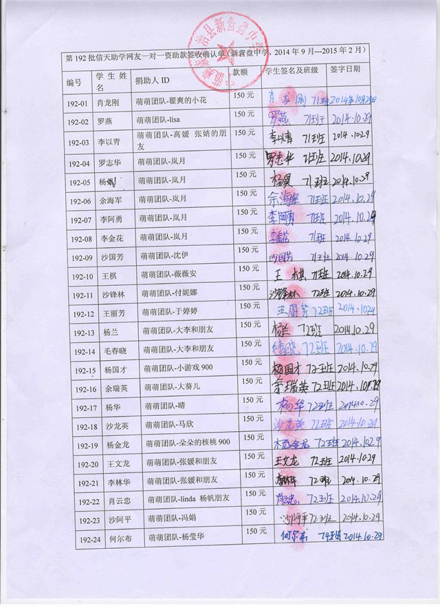 第192批新营盘中学(2014年9月-2015年2月)受助生签收单