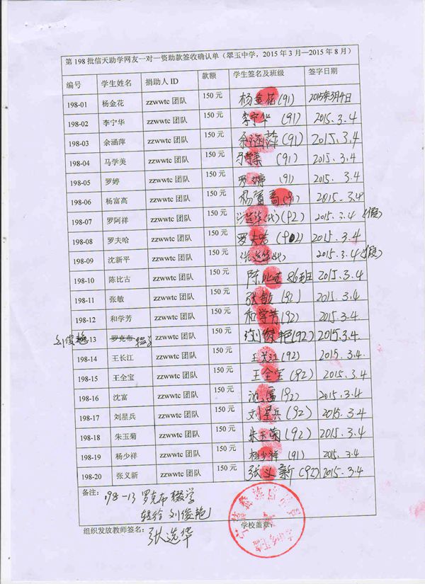 第198批翠玉中学(2015年3月-2015年8月)受助生签收单