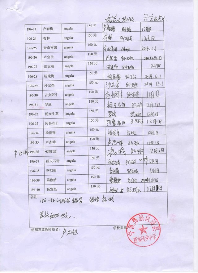 6、全部捐助款到漫步轻灵这里后,她会按学期分次汇给浦理智老师,浦理智老师和学校的负责老师再分发给受助学生(学生每学期收到150元),一一签字确认。知识改变命运,愿这些学生将来不再重复父辈们那艰辛苦难的日子。