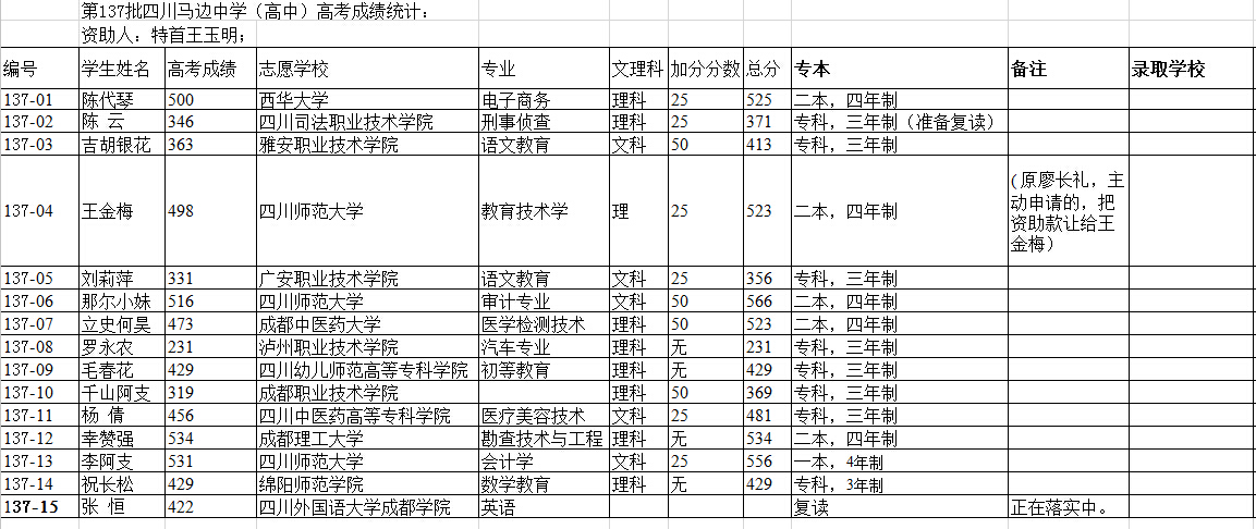 » 2015年信天助学受助学生高考成绩统计(2015年7月12日))