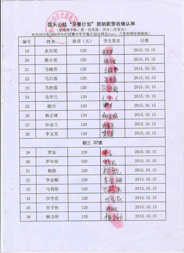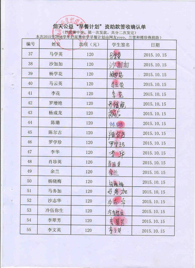 烂泥箐中学,2015-2016年早餐计划第一次发款签收单