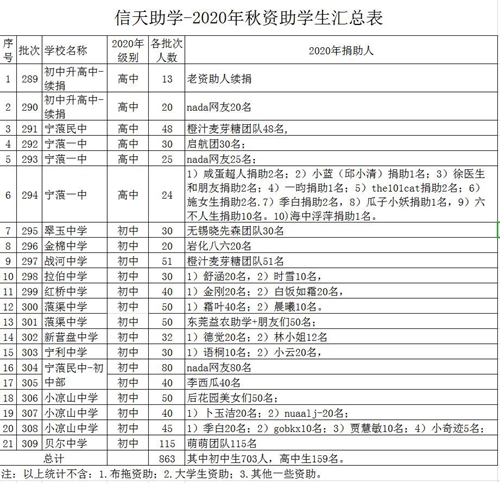 (3)学生名单等到暑假开学后根据考试成绩、家庭情况,再做挑选。因为秋季开学后接连很多假期,如教师节、中秋节、国庆节、火把节等。所以受助生名单出来会在9-10月份陆续提供,个别批次的名单会到11月份出来。敬请理解。