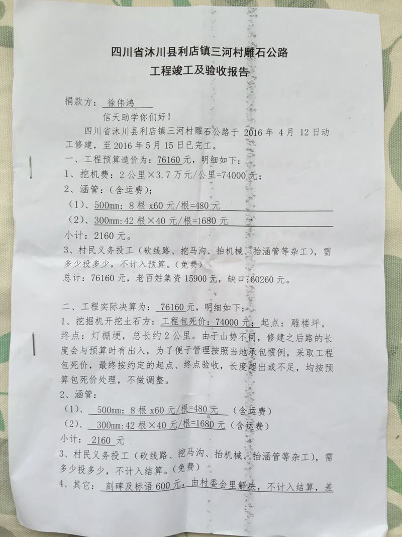 以上合计总价:76160元,老百姓集资15900元,尚有资金缺口60260元。