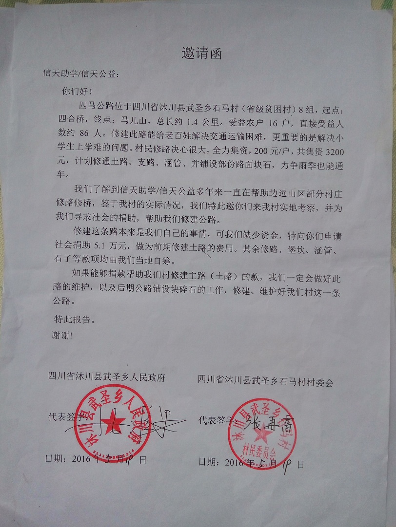 四马公路位于四川省沐川县武圣乡石马村(省级贫困村)8组,起点的片区叫四核桃,起点:四合桥,终点:马儿山,总长约1.4公里。总受益人数:直接受益16户,86人,间接受益人数为386人。修建此路能给老百姓解决交通运输困难,为村民看病救急提供了快捷通道、还能解决小学生上学难的问题。
