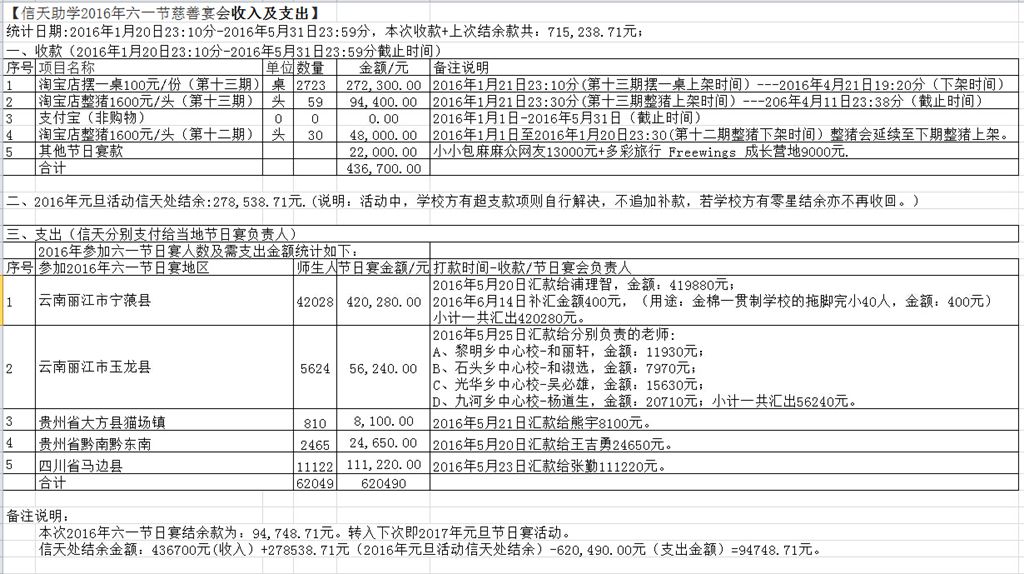 本次六一节日宴信天处结余款为: 94,748.71元,转入下次即2017年元旦节日宴活动。