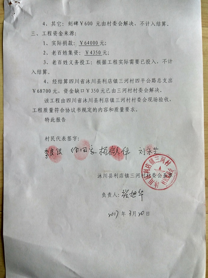 以上合计总价:68700 元,老百姓集资:4350元,尚有资金缺口64350元。