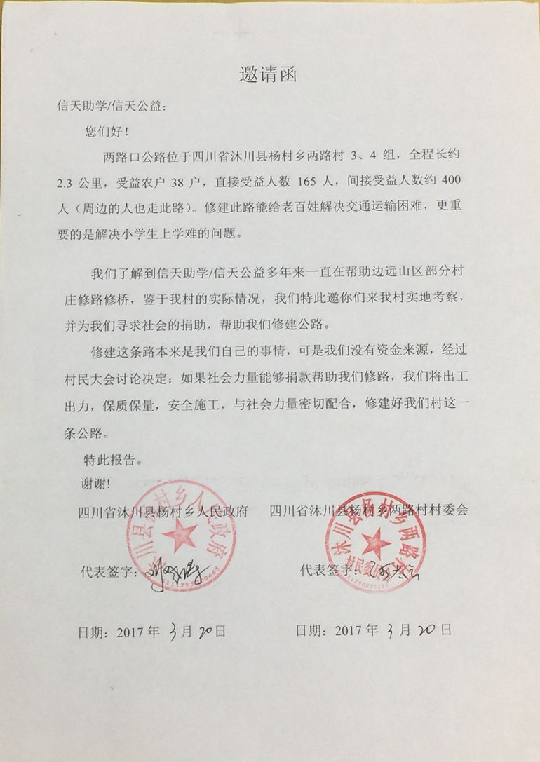 两路口公路位于四川省沐川县杨村乡两路村3、4组,起点:两路口,终点:打桶沟,全程长约2.3公里,受益农户38户,直接受益人数 165人,间接受益人数约400人。修建此路能给老百姓解决交通运输困难,更重要的是解决小学生上学难的问题。村民修路决心很大,全力集资,200元/户,共集资7600元,计划修通土路、支路、涵管、并铺设部份路面块石,力争雨季也能通车。