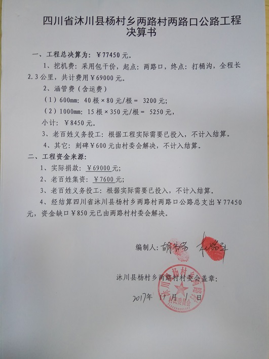 以上合计总价:¥77450 元,老百姓集资¥ 7600 元,尚有资金缺口 ¥69850元。