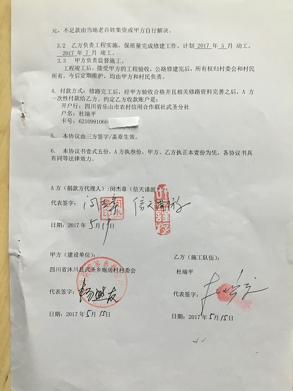 (5)修路预算分好几部分,有挖掘机、涵管、炸药爆破(山崖需要爆破)、堡坎、村民义务工、征地等。修路,我们不全包,我们出一大部分钱:挖掘费用、山崖爆破等。村民出义务工、涵管、征地费、村民小额集资。