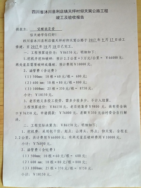 (5)修路预算分好几部分,有挖掘机、涵管、炸药爆破(山崖需要爆破)、堡坎、村民义务工、征地等。修路,我们不全包,我们出一大部分钱:挖掘费用、山崖爆破等。村民出义务工、涵管、征地费、村民小额集资。