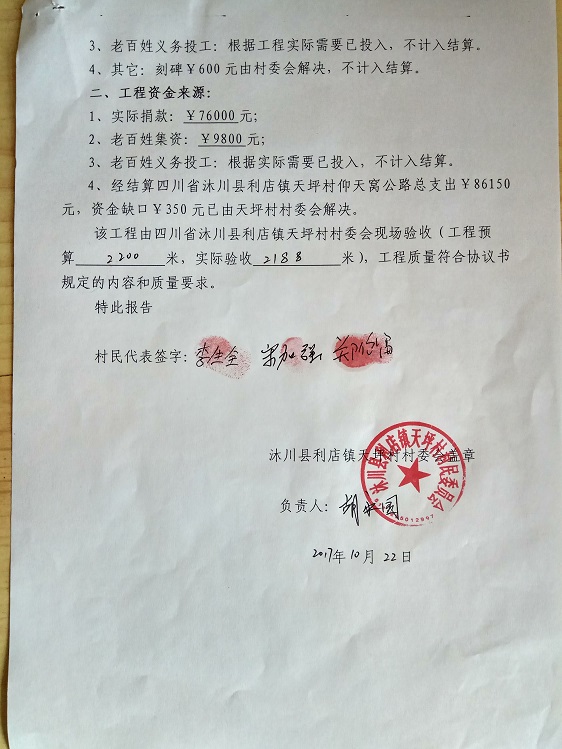 (4) 有的地方村民太困难,在大山更深处,这样,我们就尽量不让村民再集资了,只投工投劳就可以了。而,有的地方小水泥路就通到了山脚下,我们修路来接通外界的小水泥路,这样,材料可以直接运输到山脚下,村民除了投工投劳,就再集资一些钱,我们共同修建山村公路。