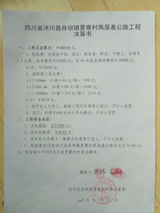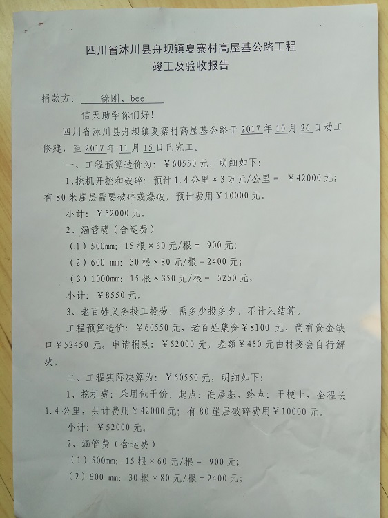 (5)修路预算分好几部分,有挖掘机、涵管、炸药爆破(山崖需要爆破)、堡坎、村民义务工、征地等。修路,我们不全包,我们出一大部分钱:挖掘费用、山崖爆破等。村民出义务工、涵管、征地费、村民小额集资。