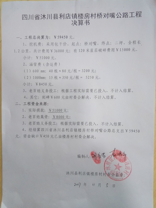 拟捐款:¥51000元,不足部分由村委会解决。