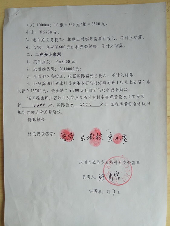 以上合计总价:75700元,老百姓集资 10000元,尚有资金缺口 65700。