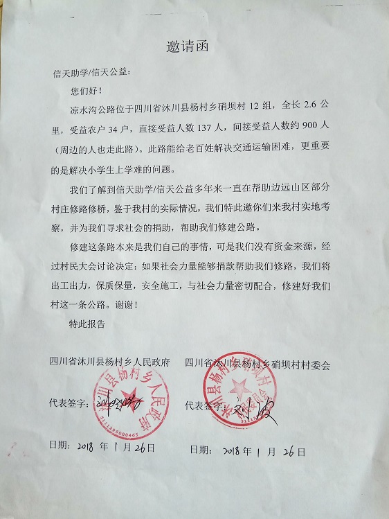 凉水沟公路位于四川省沐川县杨村乡硝坝村12组,全长2.6公里,起点:凉水沟,终点:小坝子,受益农户34户,直接受益人数137人,间接受益人数约900人(周边的人也走此路)。此路能给老百姓解决交通运输困难,更重要的是解决小学生上学难的问题。村民修路决心很大,全力集资,400元/户,共集资13600元,计划修通土路、支路、涵管、并铺设部份路面块石,力争雨季也能通车。