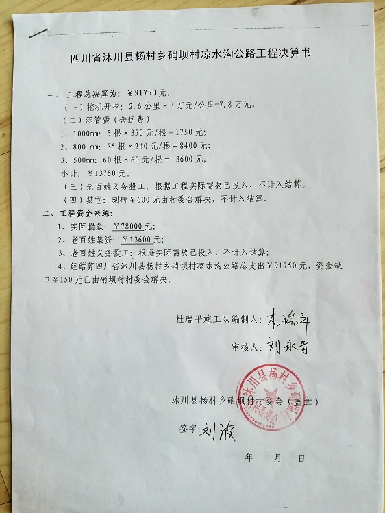 (5)修路预算分好几部分,有挖掘机、涵管、炸药爆破(山崖需要爆破)、堡坎、村民义务工、征地等。修路,我们不全包,我们出一大部分钱:挖掘费用、山崖爆破等。村民出义务工、涵管、征地费、村民小额集资。