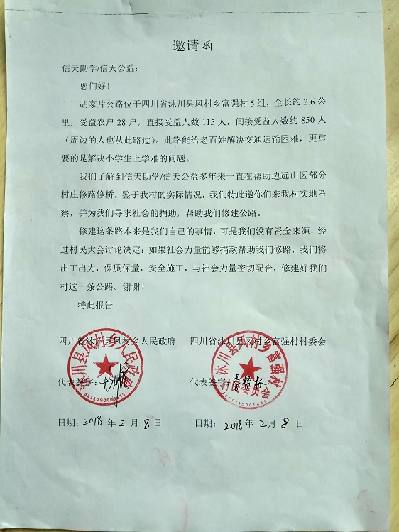 胡家片公路位于四川省沐川县凤村乡富强村5组,全长约2.6公里,起点:胡家片,终点:大潮头,受益农户28户,直接受益人数115人,间接受益人数约850人(周边的人也从此路过)。此路能给老百姓解决交通运输困难,更重要的是解决小学生上学难的问题。村民修路决心很大,全力集资,400元/户,共集资11200元,计划修通土路、支路、涵管、并铺设部份路面块石,力争雨季也能通车。