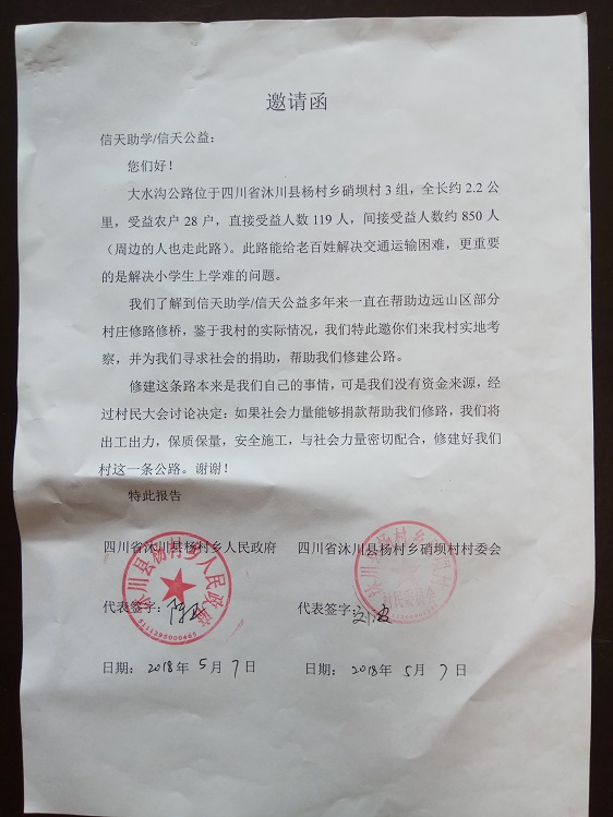 大水沟公路位于四川省沐川县杨村乡硝坝村3组,全长约2.2公里,起点:大水沟,终点:大沟头,受益农户28户,直接受益人数119人,间接受益人数约850人(周边的人也走此路)。此路能给老百姓解决交通运输困难,更重要的是解决小学生上学难的问题。村民修路决心很大,全力集资,300元/户,共集资8400元,计划修通土路、支路、涵管、并铺设部份路面块石,力争雨季也能通车。
