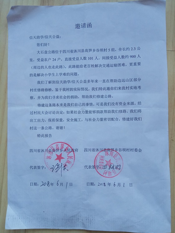 大石盘公路位于四川省沐川县高笋乡谷坝村5组,全长约2.3公里,起点:上塘口,终点:大石盘,受益农户24户,直接受益人数101人,间接受益人数约900人(周边的人也走此路)。此路能给老百姓解决交通运输困难,更重要的是解决小学生上学难的问题。村民修路决心很大,全力集资,350元/户,共集资8400元,计划修通土路、支路、涵管、并铺设部份路面块石,力争雨季也能通车。