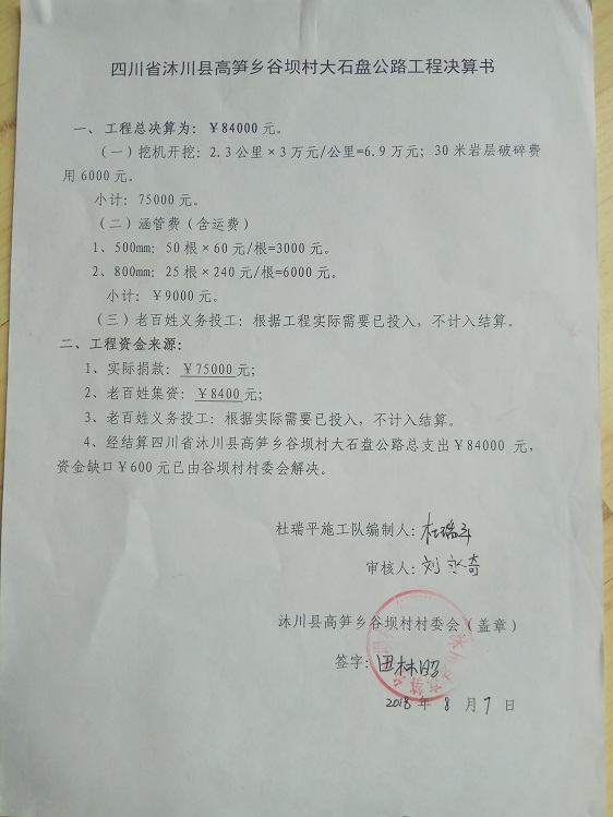 (5)修路预算分好几部分,有挖掘机、涵管、炸药爆破(山崖需要爆破)、堡坎、村民义务工、征地等。修路,我们不全包,我们出一大部分钱:挖掘费用、山崖爆破等。村民出义务工、涵管、征地费、村民小额集资。