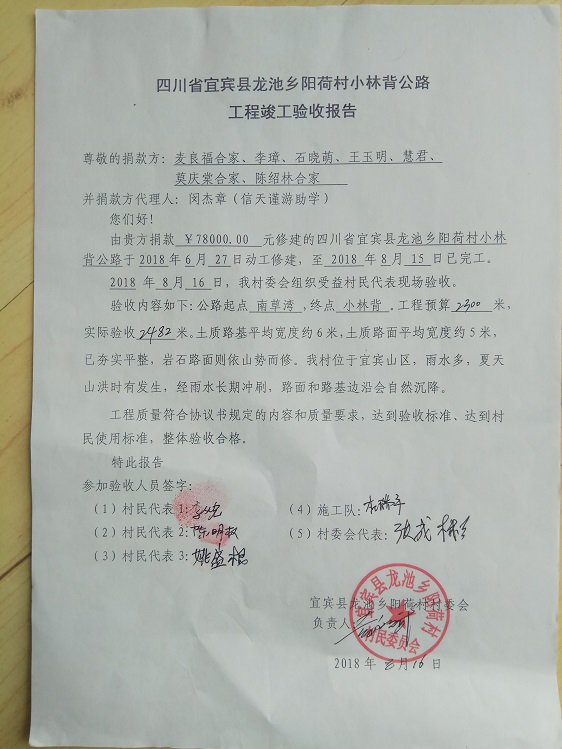 (1)爱心人捐款、村民投工投劳一起修土路,干季可以通车;