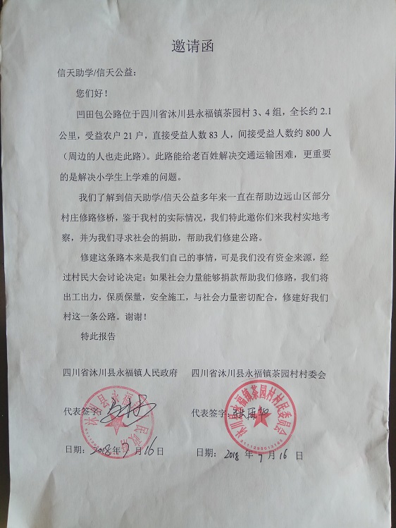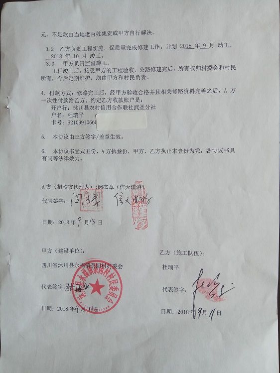 (1)爱心人捐款、村民投工投劳一起修土路,干季可以通车;