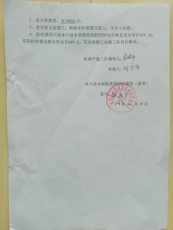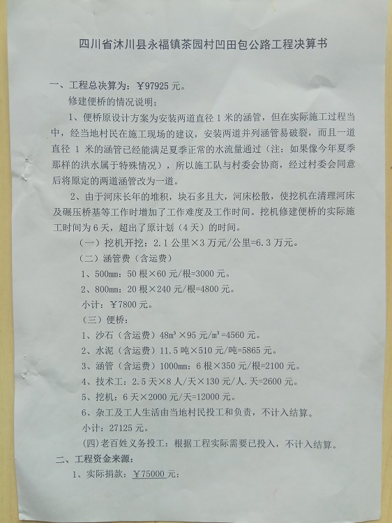 (5)修路预算分好几部分,有挖掘机、涵管、炸药爆破(山崖需要爆破)、堡坎、村民义务工、征地等。修路,我们不全包,我们出一大部分钱:挖掘费用、山崖爆破等。村民出义务工、涵管、征地费、村民小额集资.