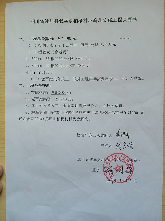 (5)修路预算分好几部分,有挖掘机、涵管、炸药爆破(山崖需要爆破)、堡坎、村民义务工、征地等。修路,我们不全包,我们出一大部分钱:挖掘费用、山崖爆破等。村民出义务工、涵管、征地费、村民小额集资。