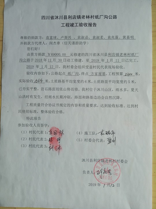 纸厂沟公路位于四川省沐川县利店镇老林村2组,全长约2.3公里,起点:纸厂沟,终点:方家屋基。受益农户26户,直接受益人数88人,间接受益人数约850人(周边的人也走此路)。此路能给老百姓解决交通运输困难,更重要的是解决小学生上学难的问题。村民修路决心很大,全力集资,300元/户,共集资7800元,计划修通土路、支路、涵管、并铺设部份路面块石,力争雨季也能通车。