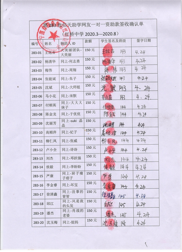 第283批红桥中学(2020年2月-2020年8月)受助生签收单