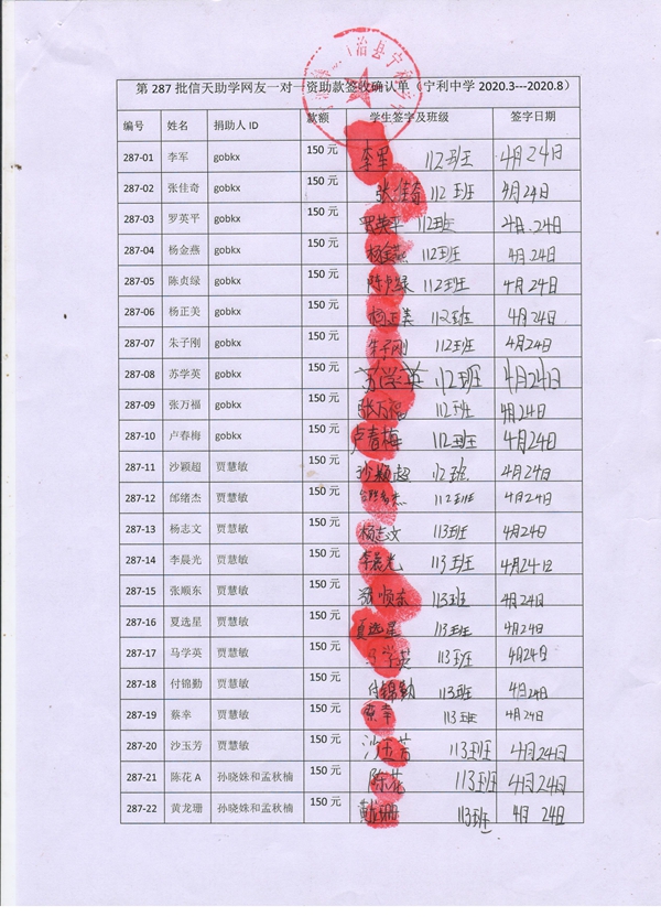第287批宁利中学(2020年3月到2020年8月)受助学生签收单