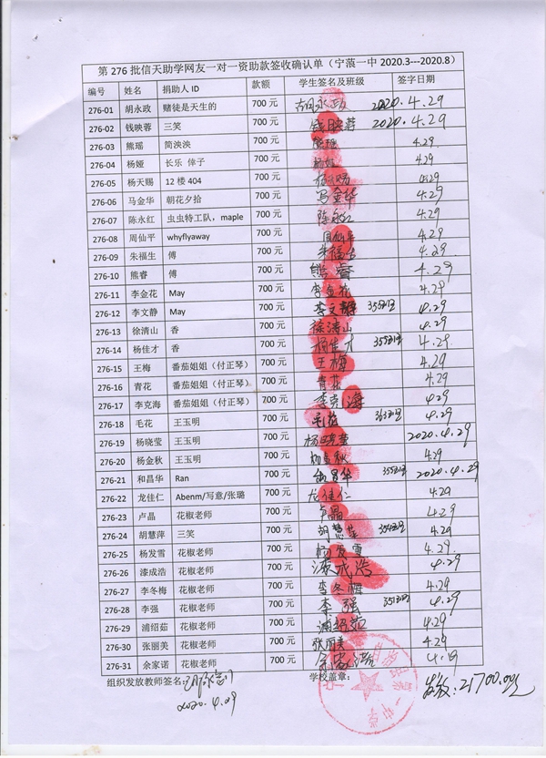第276批宁蒗一中(2020年3月-2020年8月)受助学生签字确认单