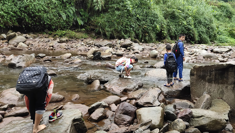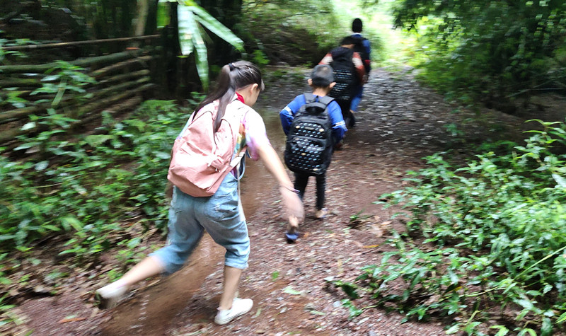 小学生上学之路,等修好了路之后,就可以坐三轮车、面包车上学了,或者骑自行车上学了。