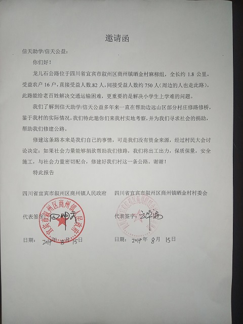 龙儿石公路位于四川省宜宾市叙州区商州镇晒金村麻柳组,全长约1.8公里,起点:龙儿石,终点:柏果坪。受益农户16户,直接受益人数82人,间接受益人数约750人(周边的人也走此路)。此路能给老百姓解决交通运输困难,更重要的是解决小学生上学难的问题。村民修路决心很大,全力集资,300元/户,共集资4800元,计划修通土路、支路、涵管、并铺设部份路面块石,力争雨季也能通车。