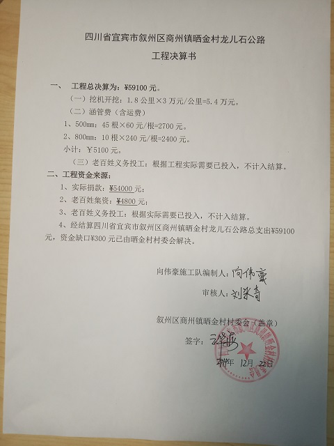 (5)修路预算分好几部分,有挖掘机、涵管、炸药爆破(山崖需要爆破)、堡坎、村民义务工、征地等。修路,我们不全包,我们出一大部分钱:挖掘费用、山崖爆破等。村民出义务工、涵管、征地费、村民小额集资。