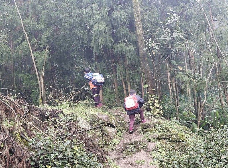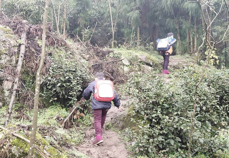 小学生上学之路,等修好了路之后,就可以坐三轮车、面包车上学了,或者骑自行车上学了。