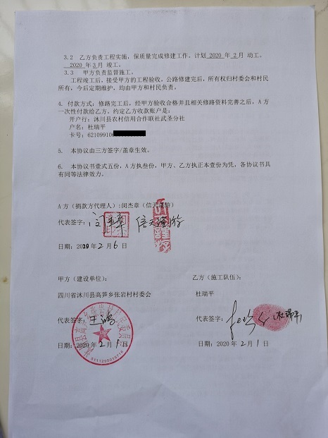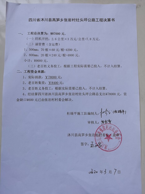 (5)修路预算分好几部分,有挖掘机、涵管、炸药爆破(山崖需要爆破)、堡坎、村民义务工、征地等。修路,我们不全包,我们出一大部分钱:挖掘费用、山崖爆破等。村民出义务工、涵管、征地费、村民小额集资。
