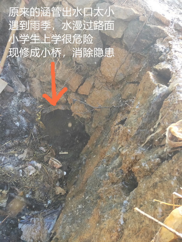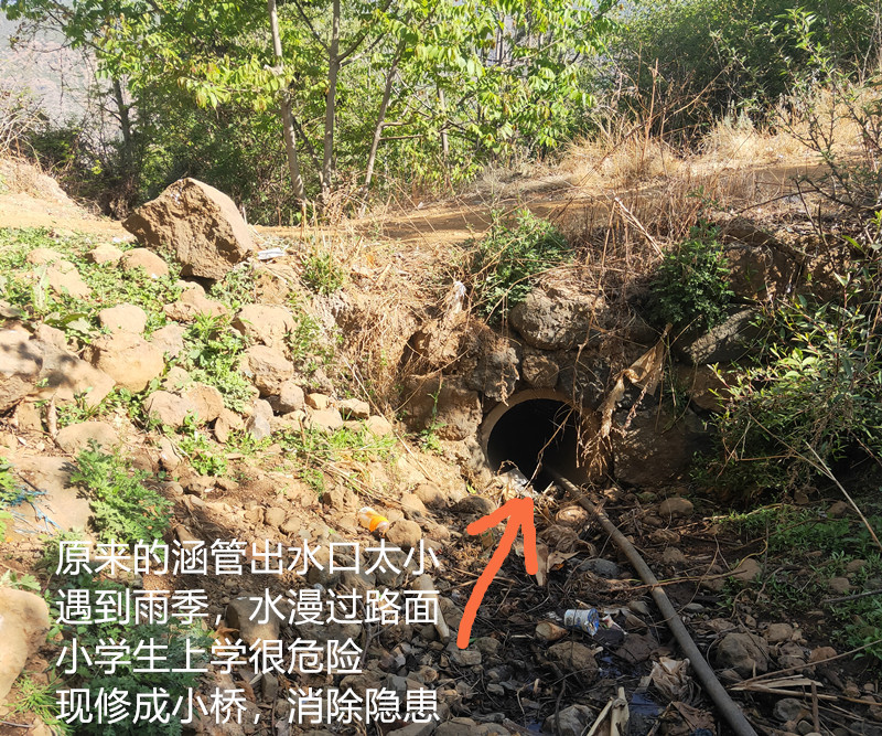 原来的涵管出水口太小,遇到雨季,水漫过路面,小学生上学很危险。
