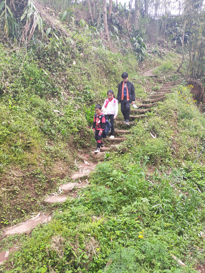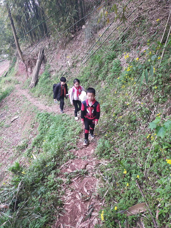 小学生上学之路,等修好了路之后,就可以坐三轮车、面包车上学了,或者骑自行车上学了。