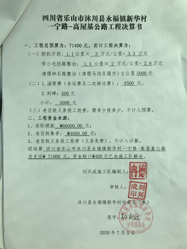 以上合计总价:71400 元,老百姓集资4600 元,尚有资金缺口 66800 元。