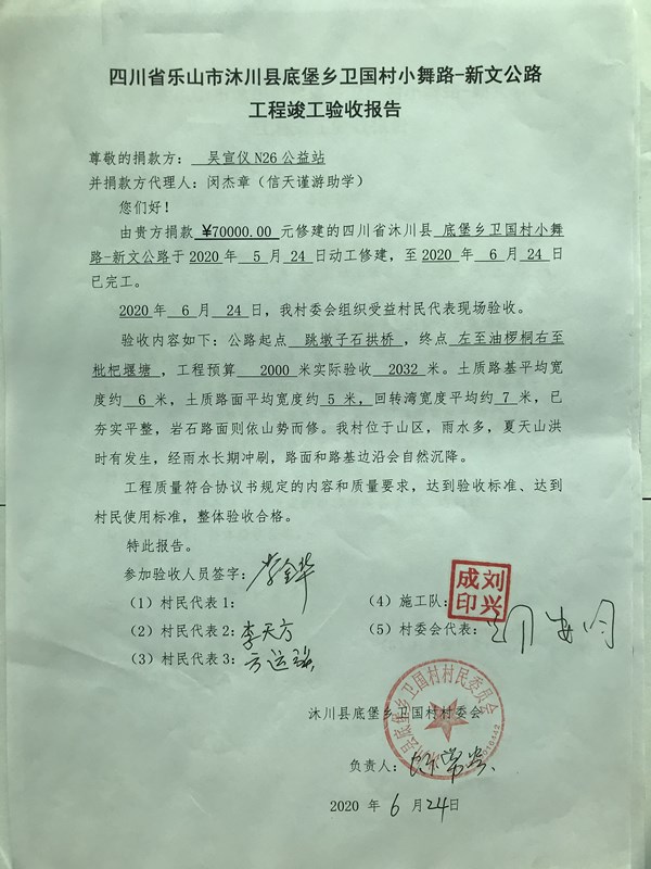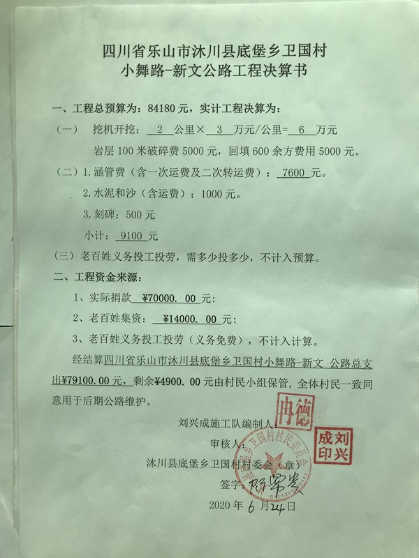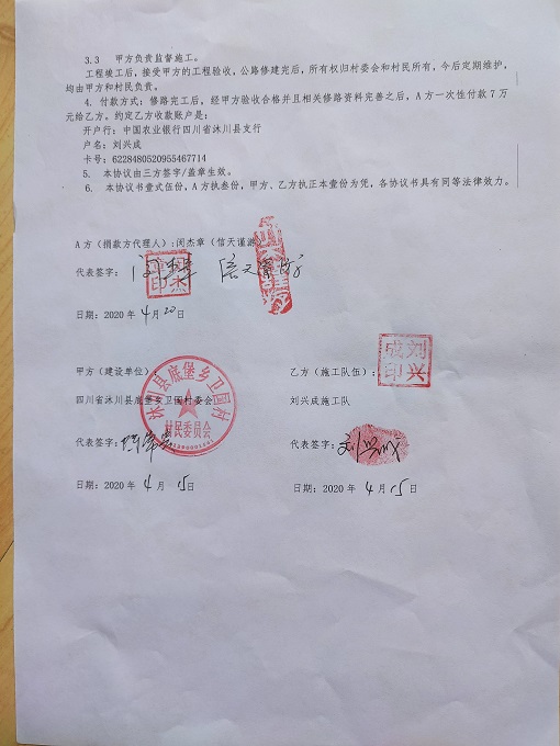 (5)修路预算分好几部分,有挖掘机、涵管、炸药爆破(山崖需要爆破)、堡坎、村民义务工、征地等。修路,我们不全包,我们出一大部分钱:挖掘费用、山崖爆破等。村民出义务工、涵管、征地费、村民小额集资。