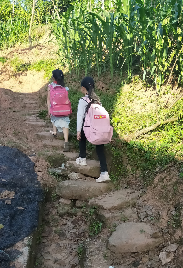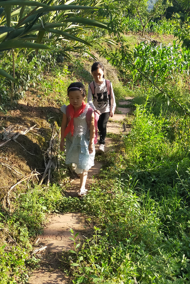 小学生上学之路,等修好了路之后,就可以坐三轮车、面包车上学了,或者骑自行车上学了。