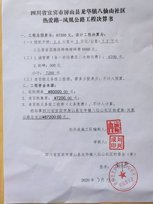 以上合计总价: 87200 元,涵管费7200元由老百姓集资,尚有资金缺口 80000 元。
