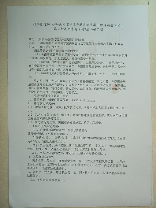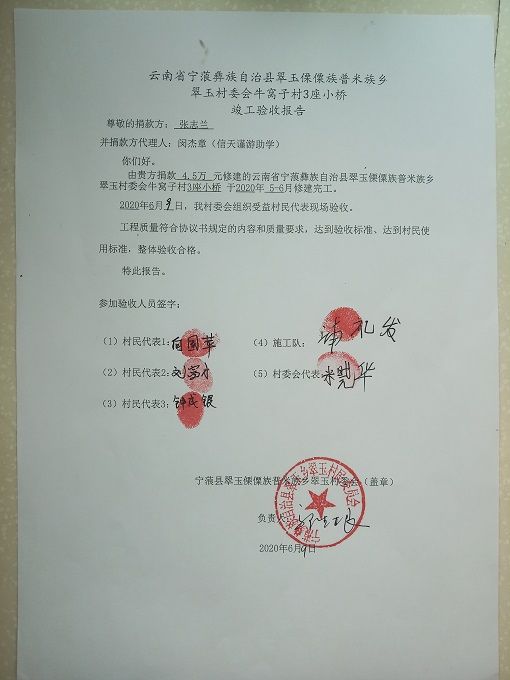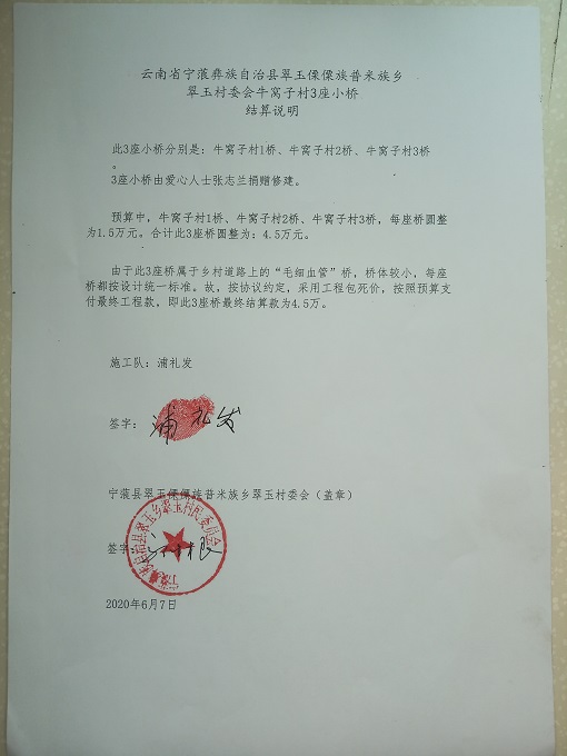爱心人士张志兰捐助4座桥,其中1座桥位于翠玉乡村委会蔡家坪,另外就是这里的3座桥。每座桥按1.5万元计,4座桥共6万余,牛窝子3座桥共4.5万余。