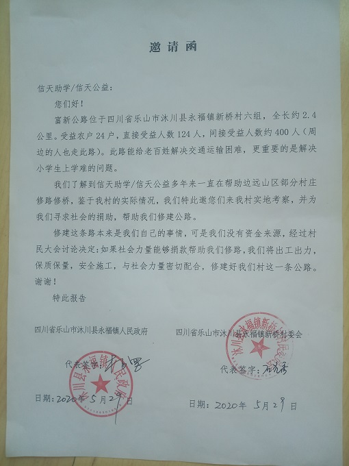 富新公路位于四川省乐山市沐川县永福镇新桥村六组,全长约 2.4公里,起点:曾家坝,终点:左至生基埂、右至老林湾,受益农户24户,直接受益人数124人,间接受益人数约 400 人。修路能给老百姓解决交通运输困难、解决小学生上学难的问题。村民修路决心很大,全力集资,400 元/户,共集资 9600元,计划修通土路、支路、涵管、并铺设部份路面石,力争雨季也能通车。