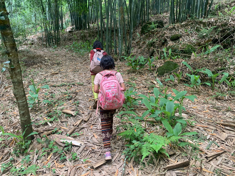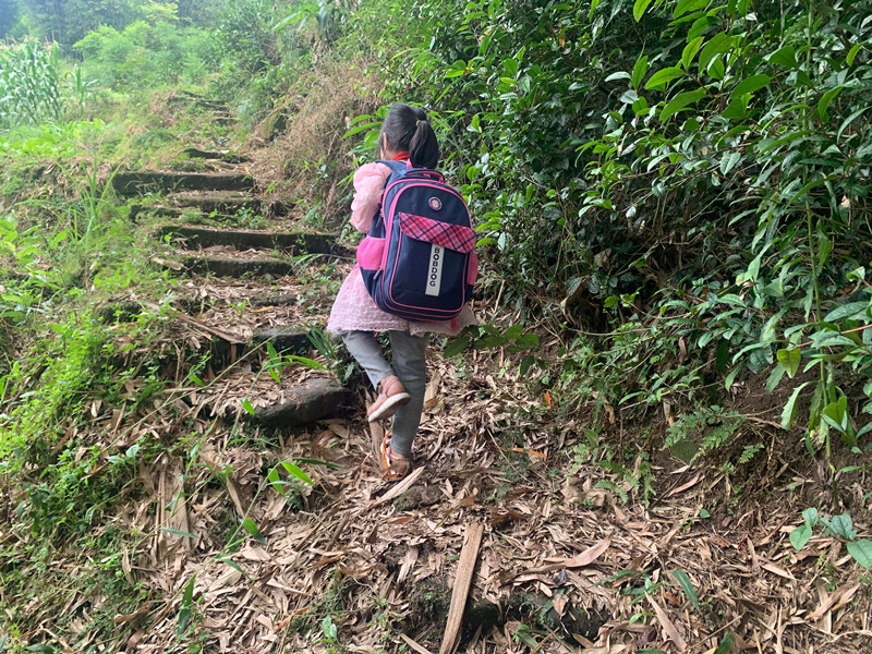 小学生上学之路,等修好了路之后,就可以坐三轮车、面包车上学了,或者骑自行车上学了。