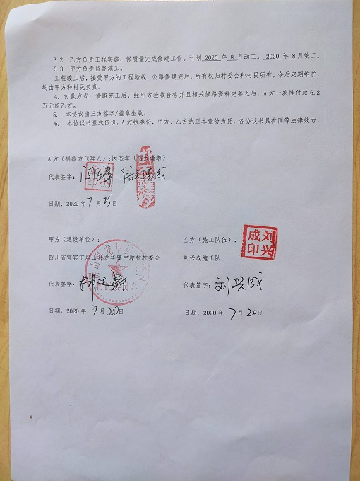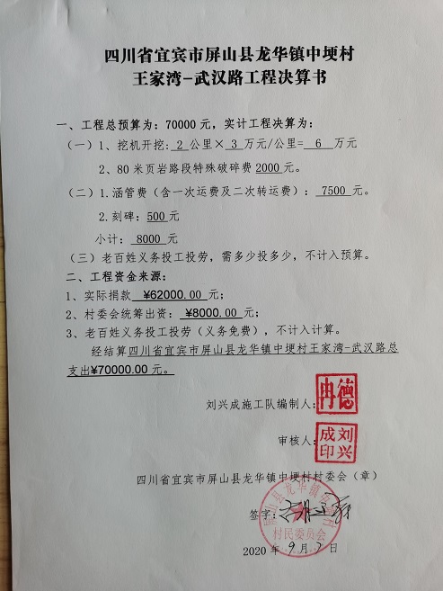 (5)修路预算分好几部分,有挖掘机、涵管、炸药爆破(山崖需要爆破)、堡坎、村民义务工、征地等。修路,我们不全包,我们出一大部分钱:挖掘费用、山崖爆破等。村民出义务工、涵管、征地费、村民小额集资。