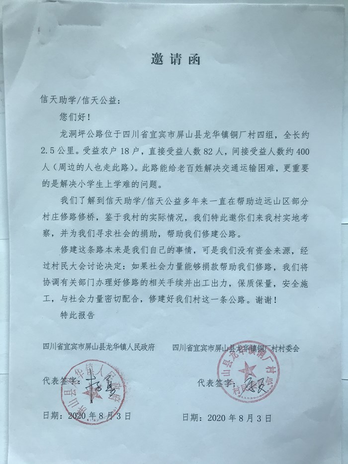 龙洞坪公路位于四川省宜宾市屏山县龙华镇铜厂村四组。全长约 2.5公里,起点:龙洞坪茶场,终点:左至石林湾,右至赶场湾,受益农户18户,直接受益人数82人,间接受益人数约 400人。修路能给老百姓解决交通运输困难、解决小学生上学难的问题。村民修路决心很大,全力集资350元/户,共集资6300元。计划修通土路、支路、涵管、并铺设部份路面石,力争雨季也能通车。