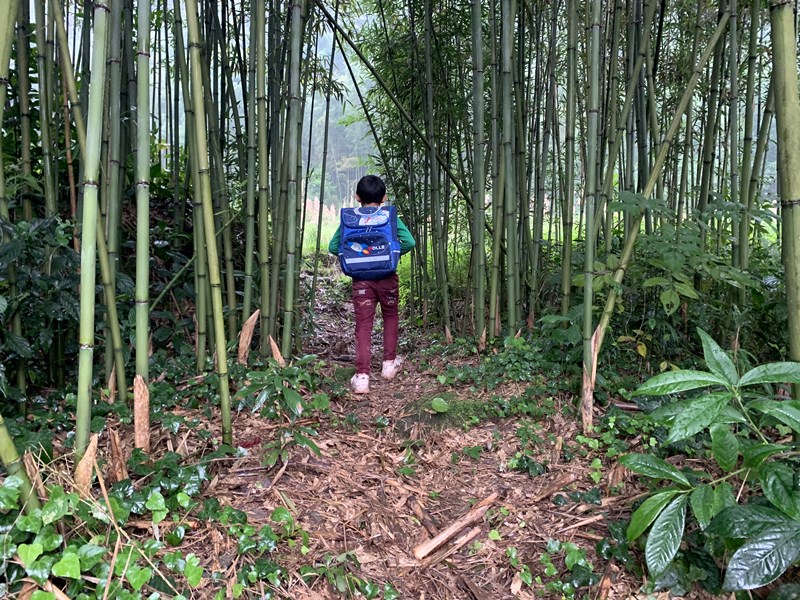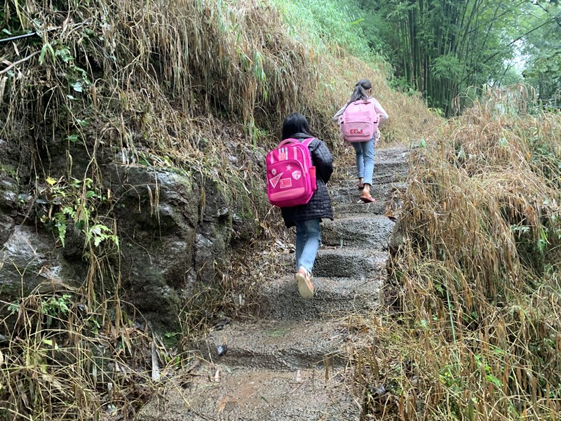 小学生上学之路,等修好了路之后,就可以坐三轮车、面包车上学了,或者骑自行车上学了。